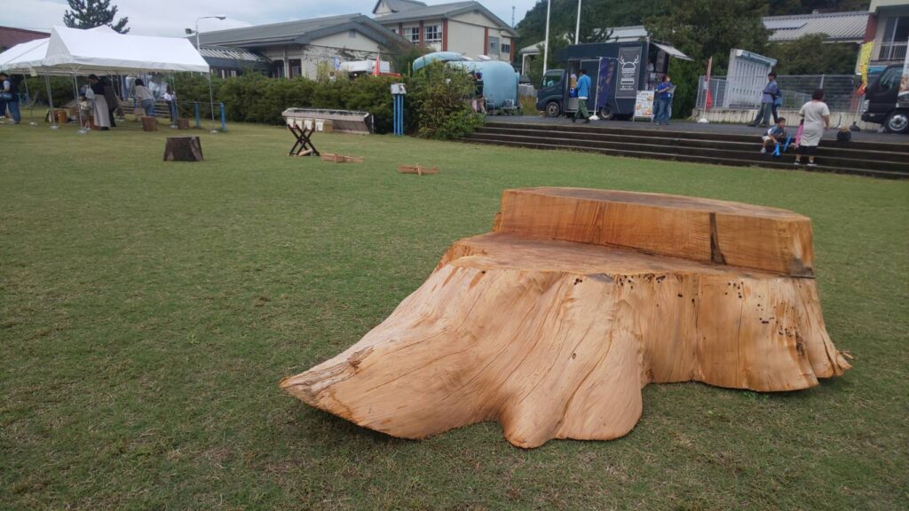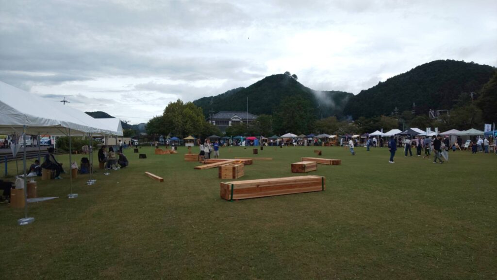 会場となったのは、近鉄大阪阿部野橋駅からは乗り換えなしの1本で来ることができる大和上市駅・吉野神宮駅から約10分の「吉野貯木場」の芝生エリアです。飲食、物販、そして多彩な体験ブースが並び、子どもから大人までが笑顔で楽しんでいました。特に印象的だったのは、芝生の上に無造作に置かれた木材です。それらは特別な展示品ではなく、ベンチとして使われたり、子どもたちがアスレチックのように上ったり降りたりして、木と戯れる「遊びの道具」となっていました。