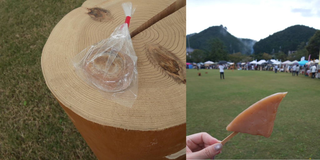 グルメブースもまた、吉野らしさに溢れていました。私が真っ先にいただいたのが、ウッドフェス限定という和菓子工房雀堂さんの桧や杉が入った「やきもち」です。スタッフの方から「結構木の味がするよ」と勧められながら、桧の方をチョイス。口に含むと、木の風味を感じ、ぎっしり詰まったあんこと相まって美味しくいただきました。吉野の木材が食にも活かされていることに驚きを覚えました。