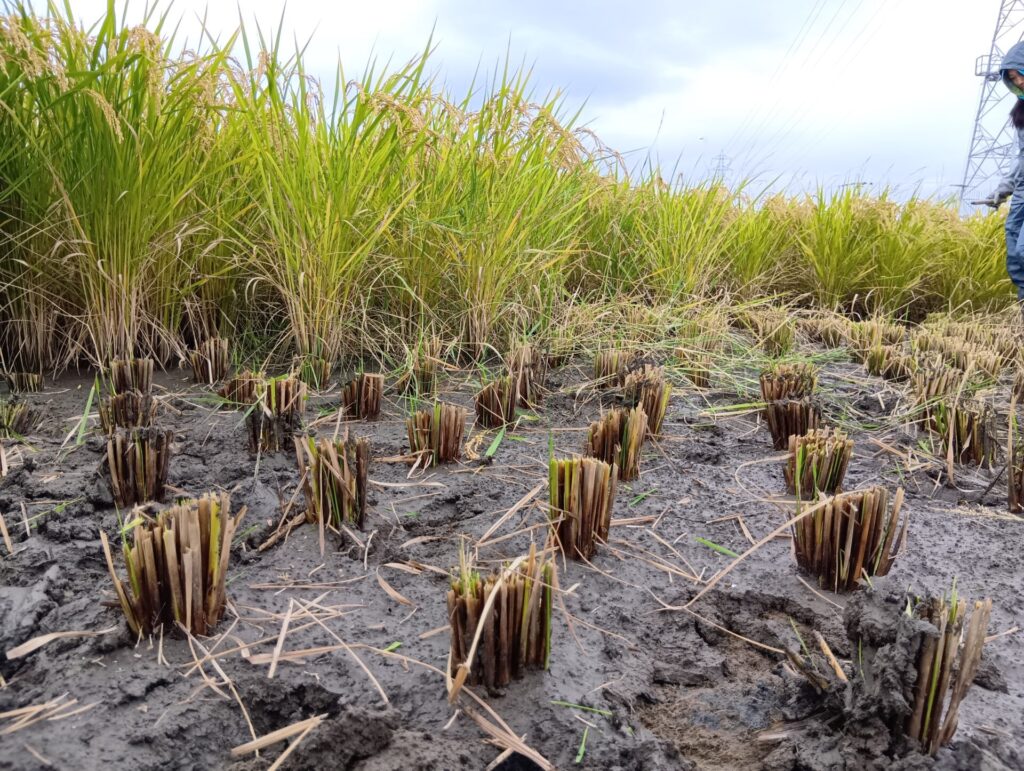 足元がぬかるんでいる田んぼの中での作業は、体力との勝負でもあります。片手で持てる2束くらいを刈って田んぼの脇に持っていき、また戻って刈るという移動の繰り返しが、地味に体力を奪っていきます。