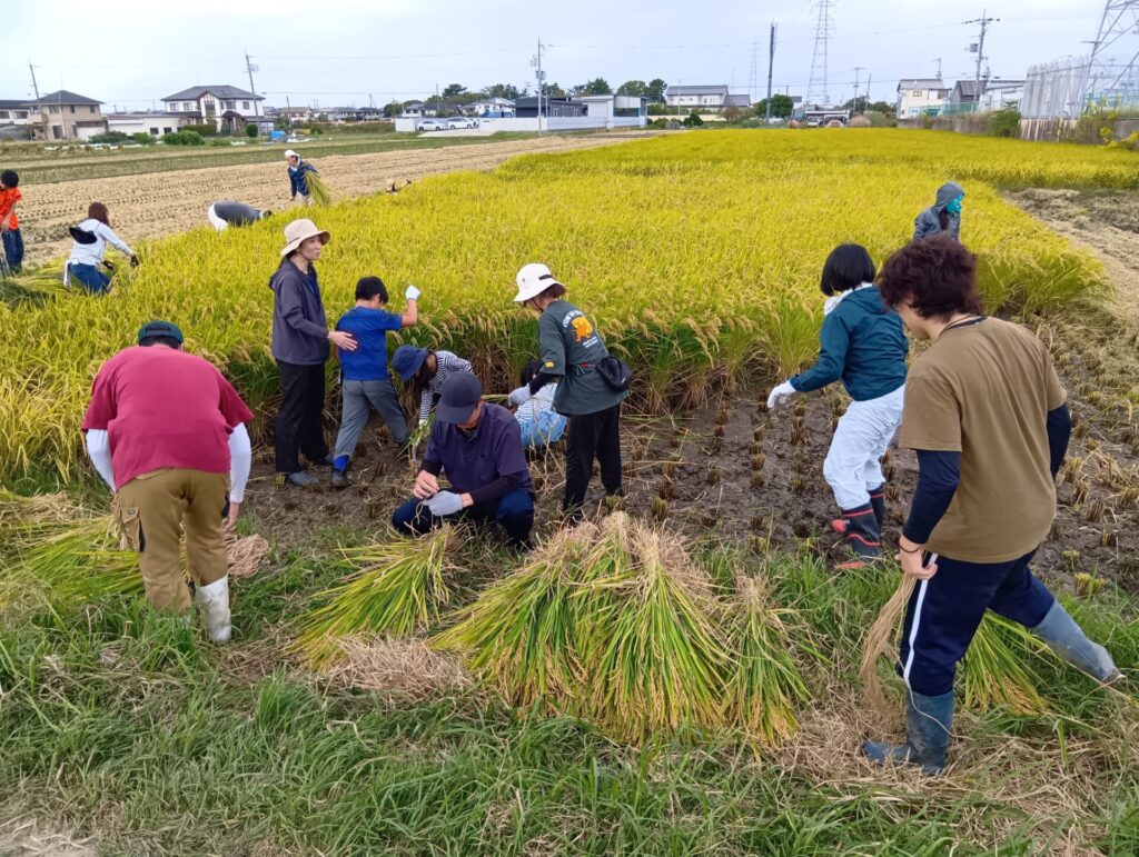 今回の体験には、6月の田植え体験に来られた方を中心に、小さなお子さん連れのご家族も多数参加されていました。6月に植えた苗がこんなにも見事に実っている姿に感動!一面黄金色の稲穂が頭を垂れ、まさに「実りの秋」を迎えていました。